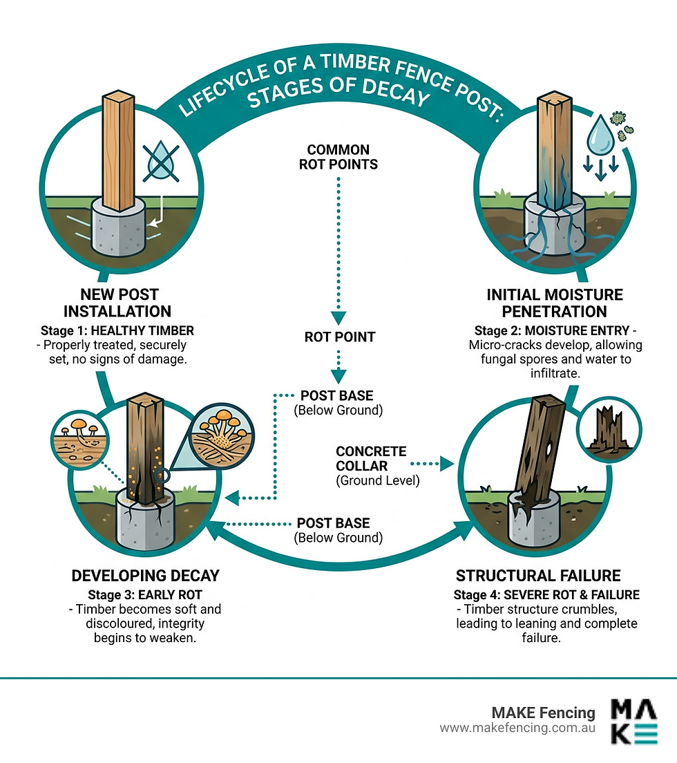 Melbourne's four-season climate is tough on timber. Rapid swings from summer heat to winter rain cause wood to expand and contract repeatedly. Over time, that movement opens up small cracks, and once moisture gets in, bacteria and fungi do the rest. The result is a post that looks fine on the surface but is quietly failing from the ground up. If you want to understand the full scope of what is involved in keeping your fence in top condition, our guide to fence repairs in Melbourne is a great place to start.